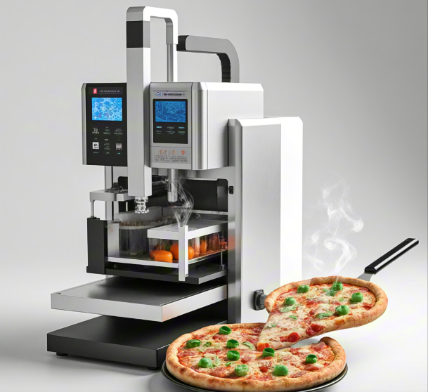打印披萨之前,首先要在电脑上画出披萨,这就像画画一样,你可以随意的画出各种形状的披萨,心形的披萨,星形的披萨,卡通人物的披萨,什么形状都可以。画好了形状后,把所需的“墨水”放进打印机的打印料筒里,就像给彩色打印机装墨盒一样。然后设置打印的参数比如打印速度,喷头直径,填充率,就像炒菜,火候和调料用量,这些都会影响披萨的效果。最后按下打印机的启动键,打印机就出来了。只见喷头在打印平台上移动,按照原先的步骤挤出面团,铺成圆形,这个披萨的饼底就做好了;然后就用番茄酱的喷头,在饼底上涂上一层色彩鲜艳的番茄酱;最后用奶酪的喷头,在番茄酱上面上一层厚厚的奶酪,这样一个披萨便做好了,不过还不能直接吃,还得放进烤箱烤一会,等奶酪融化,饼底变得金黄酥脆,披萨做好了就可以吃了。